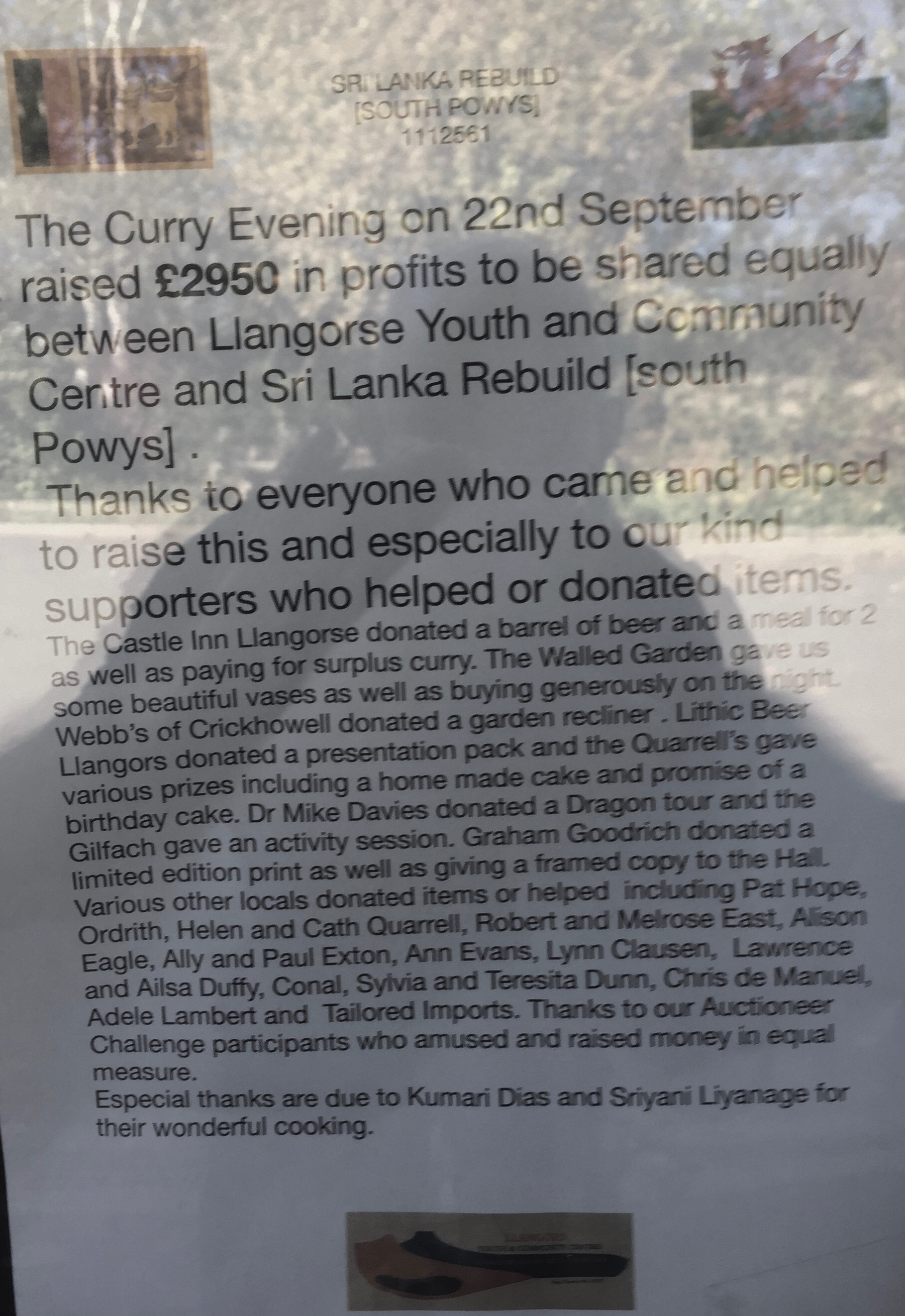 We are very grateful for a donation of £1,500 from the Sri Lanka curry evening towards the amount we need to provide.
