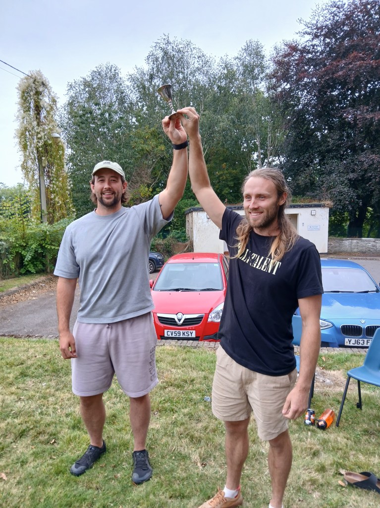 On Sunday, September 1st, the annual Llangors Boules Tournament took place on the old village hall site, with 10 teams entering the competition. During the afternoon, the teams were slowly whittled down to two, with reigning champion Izaak Duffy and his partner Robbie Davies competing against veteran Robert East and Matthew Drew in the final. The close fought match was eventually won by Izaak and Robbie. They received the coveted trophy from Melrose East, chair of Llangors Community Centre.